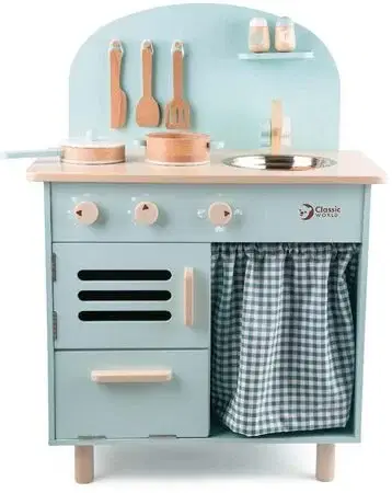 Det blå Classic World Retro Legekøkken er det perfekte legetøj til børn, der elsker at lave mad og lege køkkenchef. Med 1 legekøkken, 8 køkkenredskaber og 10 grøntsager kan børnene bruge timevis på at lege og bruge deres fantasi. Legekøkkenet har kroge til at hænge køkkenredskaberne på, og det kan også nemt rengøres med en håndvask. Det har også et komfur og et flot retro-look, som giver det et tidløst udseende. Legekøkkenet er CE-mærket og anbefales til børn fra 3 år og opefter.