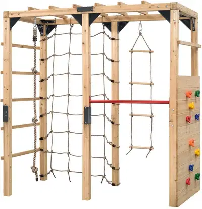 Med Swing King – Jack får du et solidt og alsidigt klatrestativ, der indbyder til aktiv udendørsleg for børn fra 3 år og opefter. Konstruktionen er fyldt med spændende detaljer som klatrenet, reb, væg og stænger – alt sammen designet til at udfordre børns motorik, balance og styrke på en sjov og tryg måde.